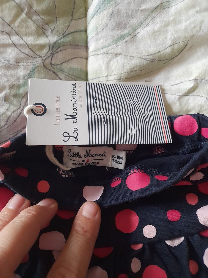 Jupe leggings Littérature Marcelle Neuf avec étiquette 74 cm pour 6-9 mois Bleu marine avec petit poid roses rouge sur la jupe