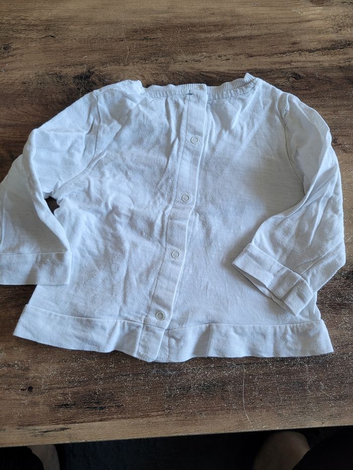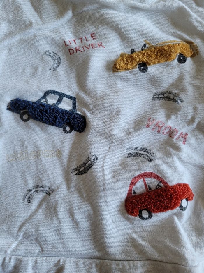 Petit T-shirt Manche longue Couleur blanc Dessin voiture Taille 12 mois Mi saison Matière 100% coton Attaché derrière