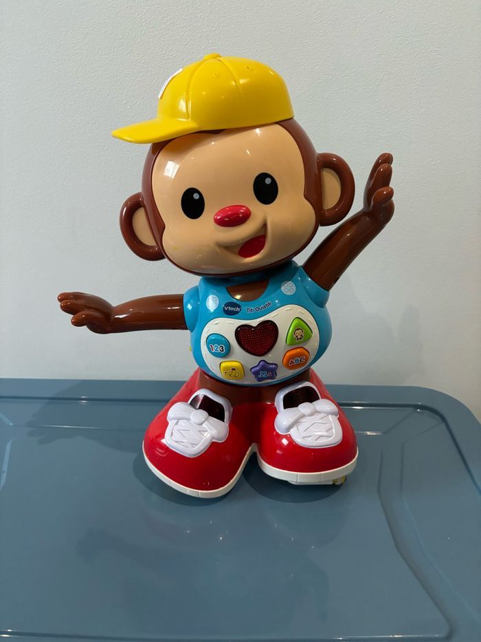 Un petit jouet singe interactif qui marche et qui danse, puis incite Bébé à le suivre partout ! Ce singe interactif malicieux appelle l'enfant mais s'enfuit dès qu'on cherche à l'attraper ! Titi Ouistiti se déplace, danse, tourne sur lui-même et incite Bébé à le suivre. 2 modes de jeu sont proposés pour accompagner votre enfant dans ses découvertes - Un mode découverte : le jouet singe danse au rythme des mélodies et invite l’enfant à chanter avec lui sur une grande variété de musiques et de chansons ; -Un mode jeux : Titi Ouistiti se déplace, il tourne sur lui même et s'enfuit dès qu'on cherche à l'attraper...Il incite Bébé à le suivre. 5 boutons Forme et un cœur lumineux situés sur le corps de Titi Ouistiti permettent de découvrir les premiers chiffres, les lettres, les parties du corps et d'autres choses amusantes. Les capteurs avant/arrière permettent au petit singe de détecter les obstacles et de les contourner. 3 chansons et 15 mélodies 2 modes de jeu : Attrape-moi et Danse Réglage du volume sonore et arrêt automatique. Très. Bon état