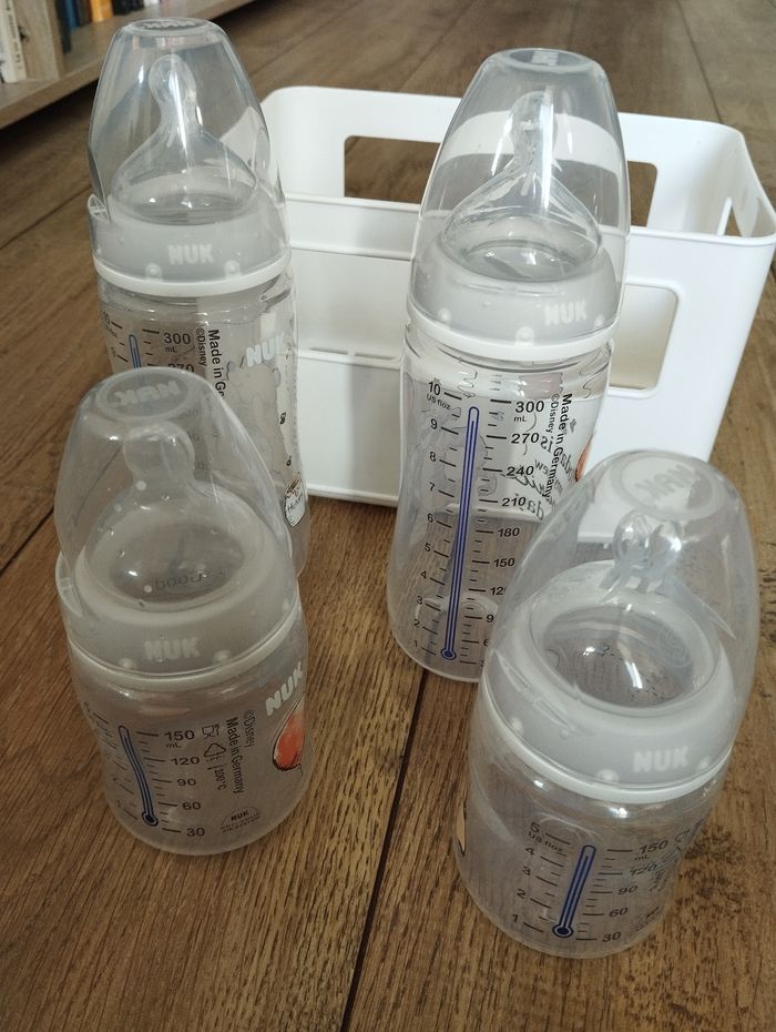 4 biberons Nuk : 2 de 150ml et 2 de 300ml Neufs, 1seul de 150ml a servi pendant 3 jours