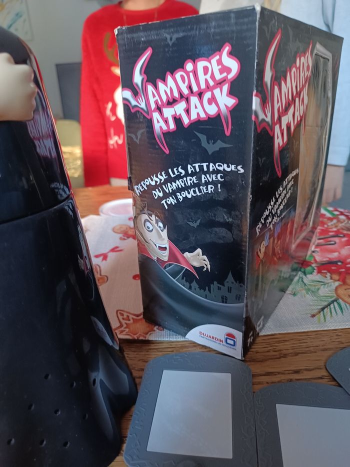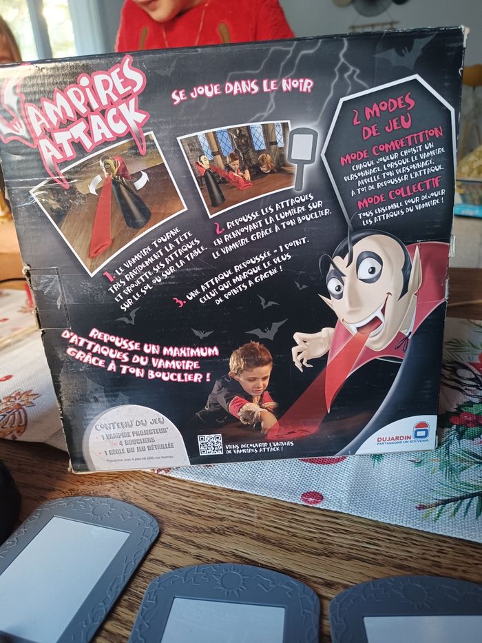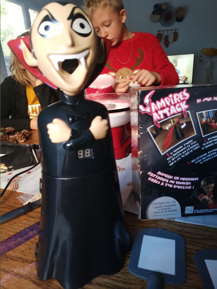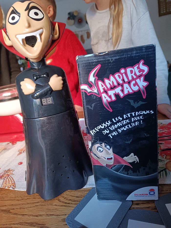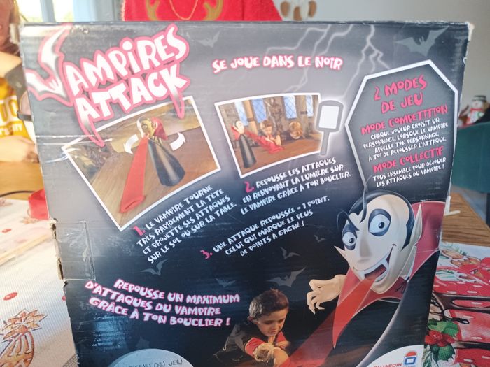 Descriptif Les enfants sauront-ils repousser le vampire ? Attention le vampire passe à l'attaque dans le noir, il va falloir repousser un maximum de ses attaques grâce aux boucliers. Pour attraper le vampire et gagner la partie il faudra lui renvoyer ses propres attaques de lumière. Les joueurs devront se munir des miroirs fournis avec le jeu afin d'essayer de refléter la lumière rouge projetée par le vampire sur lui-même et ainsi vaincre la vampire. Un jeu alliant réflexe et précision et qui saura amuser les enfants pendant de nombreuses parties. Contient : - 1 vampire projecteur - 4 boucliers - 1 règle du jeu Fonctionne avec 4 piles LR6 non incluses
