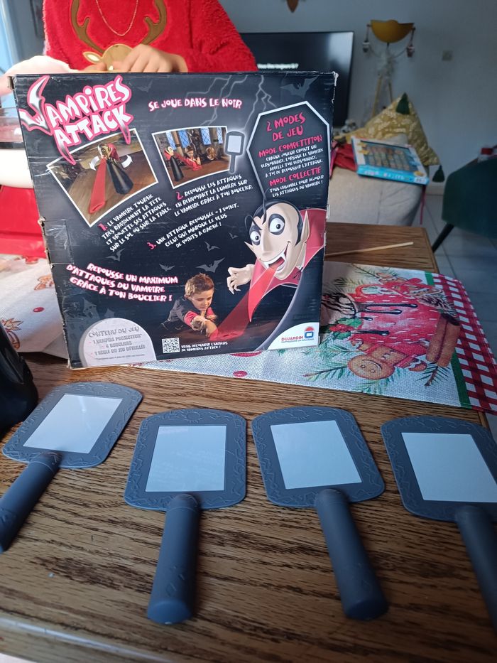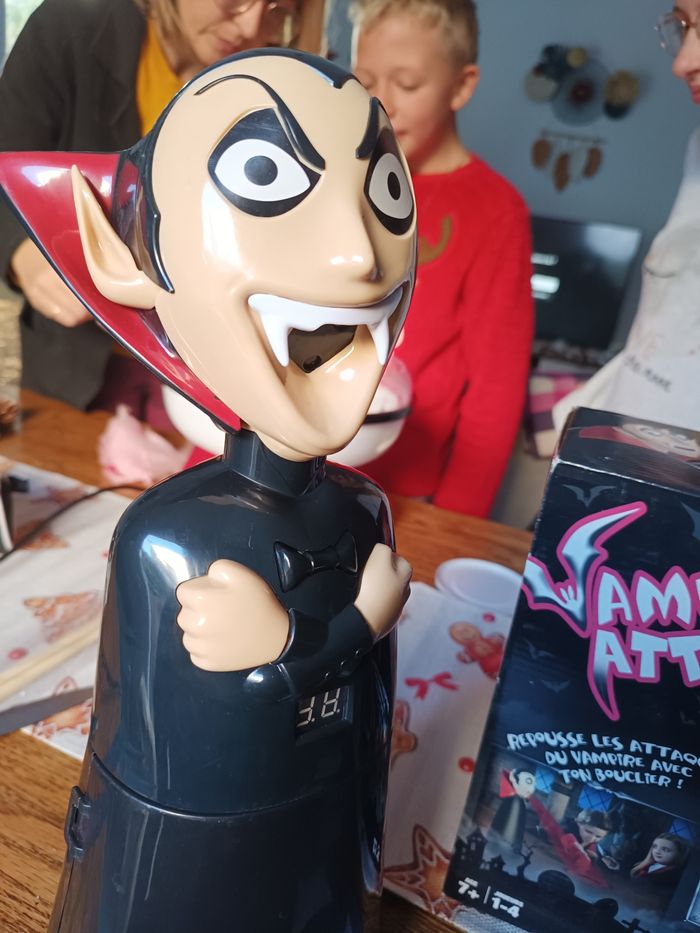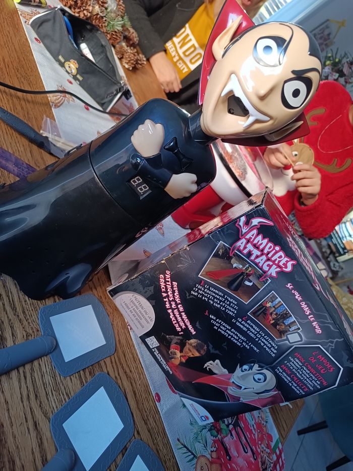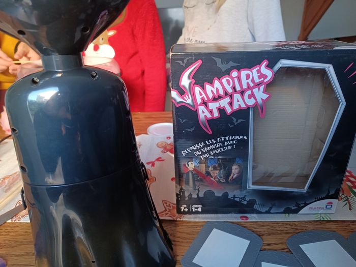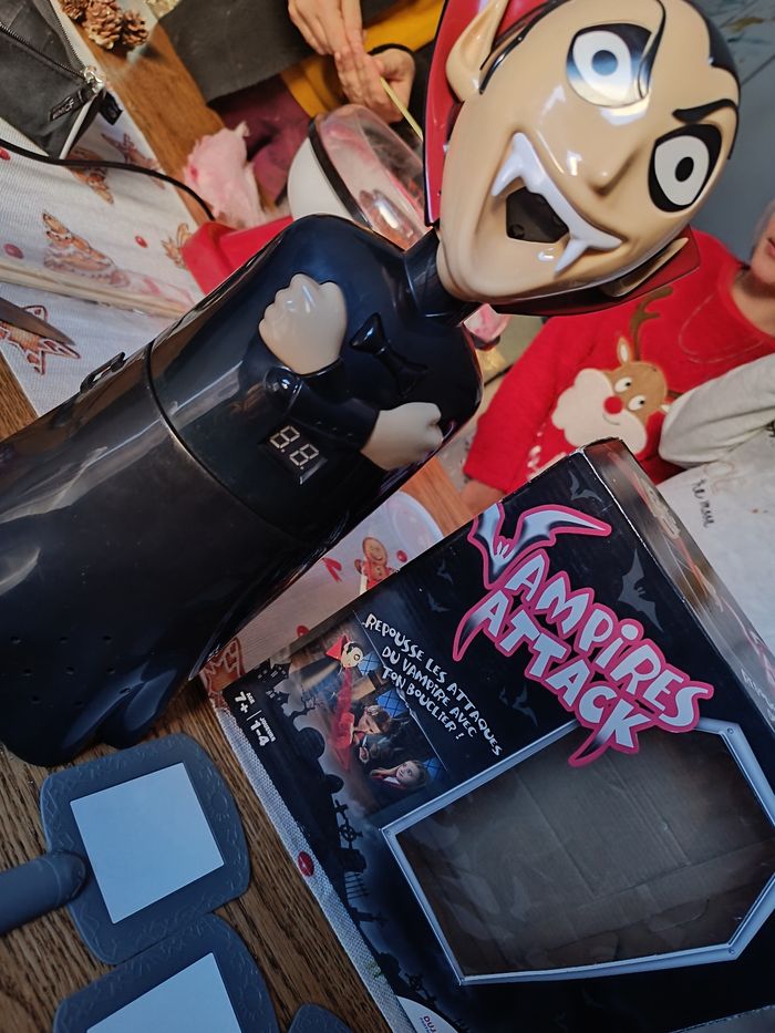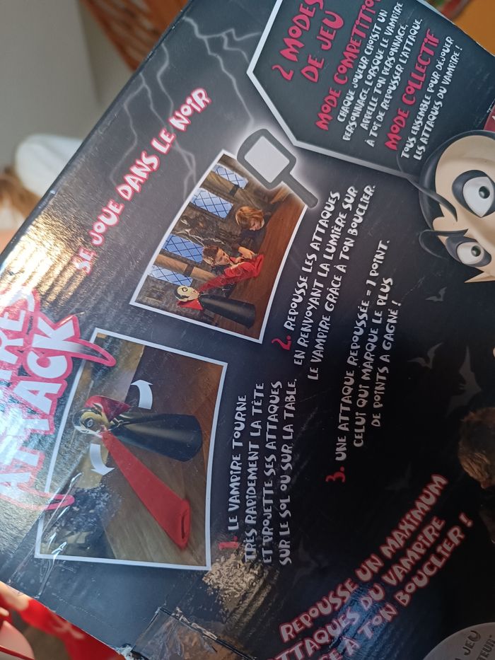 Descriptif Les enfants sauront-ils repousser le vampire ? Attention le vampire passe à l'attaque dans le noir, il va falloir repousser un maximum de ses attaques grâce aux boucliers. Pour attraper le vampire et gagner la partie il faudra lui renvoyer ses propres attaques de lumière. Les joueurs devront se munir des miroirs fournis avec le jeu afin d'essayer de refléter la lumière rouge projetée par le vampire sur lui-même et ainsi vaincre la vampire. Un jeu alliant réflexe et précision et qui saura amuser les enfants pendant de nombreuses parties. Contient : - 1 vampire projecteur - 4 boucliers - 1 règle du jeu Fonctionne avec 4 piles LR6 non incluses