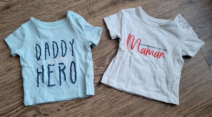 Lot de 2 Tee-shirts marque Kiabi. Taille 1 mois. 2 boutons sur épaule gauche pour ouverture. Vêtements neufs jamais portés, juste lavés. Réduction activée pour achats en lot. Pour retrouver les vêtements taille 1 mois: #barbara0122_1_mois. #teeshirtmanchescourtes #teeshirt1moisgarcon #teeshirtkiabi #daddyismyhero #laplusgenialecestmamaman