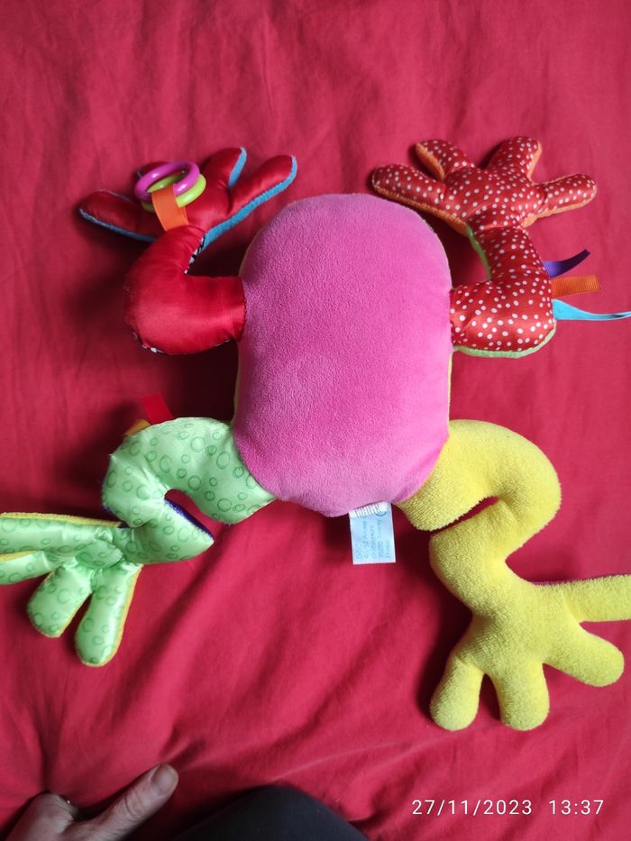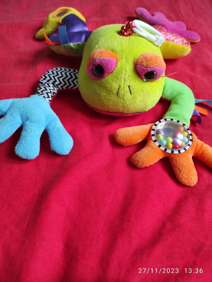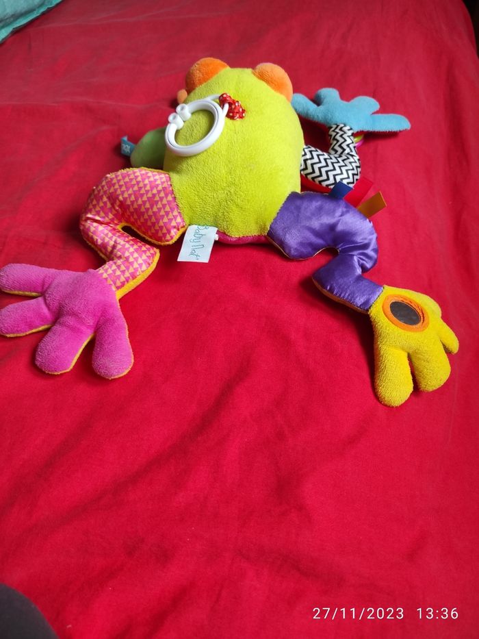 LOULA LA GRENOUILLE est un super vibrato d'éveil qui émet d'amusants coassements dès qu'on l'actionne. Ludique, très coloré et facile à manipuler, il est muni d'un anneau qui permet de déclencher le vibrato et de le suspendre facilement partout. Avec ses différentes activités, il promet de grands instants de découverte et d'éveil: anneaux, hochet avec perles multicolores apparentes, pouet, miroir, vibrato, sons et papier craquant, sans oublier la richesse des différentes matières, étiquettes, imprimés et couleurs . Présenté sur carte. Lavage en machine 30°. Séchage naturel ou mécanique à basse température. Dès la naissance Très bon état