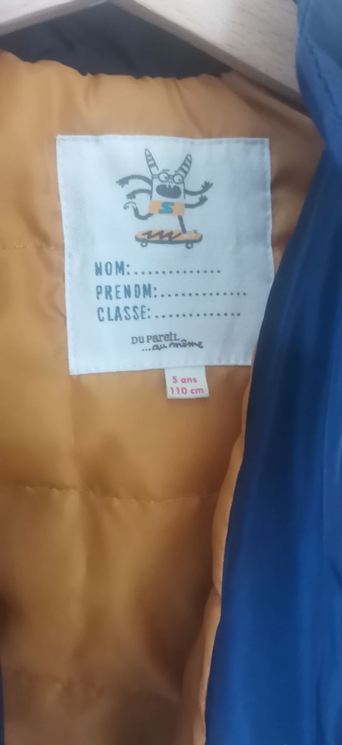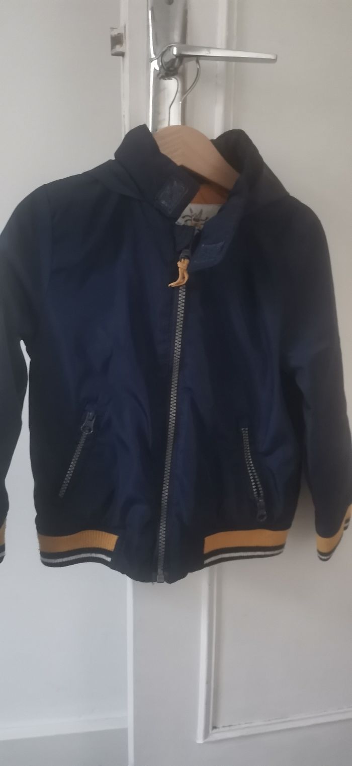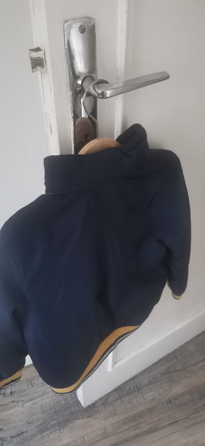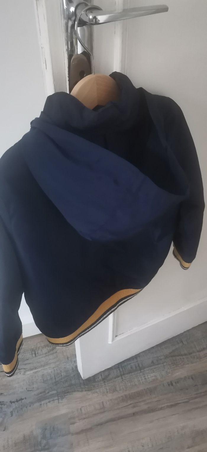 Blouson garçon bleu avec capuche. 2 poches latérales. À côté de la poche droite, il y des petits bouloches pas très visibles. En haut à côté du col côté droit aussi, il y quelques bouloches aussi. À l'intérieur, tissu jaune est un peu fripé.