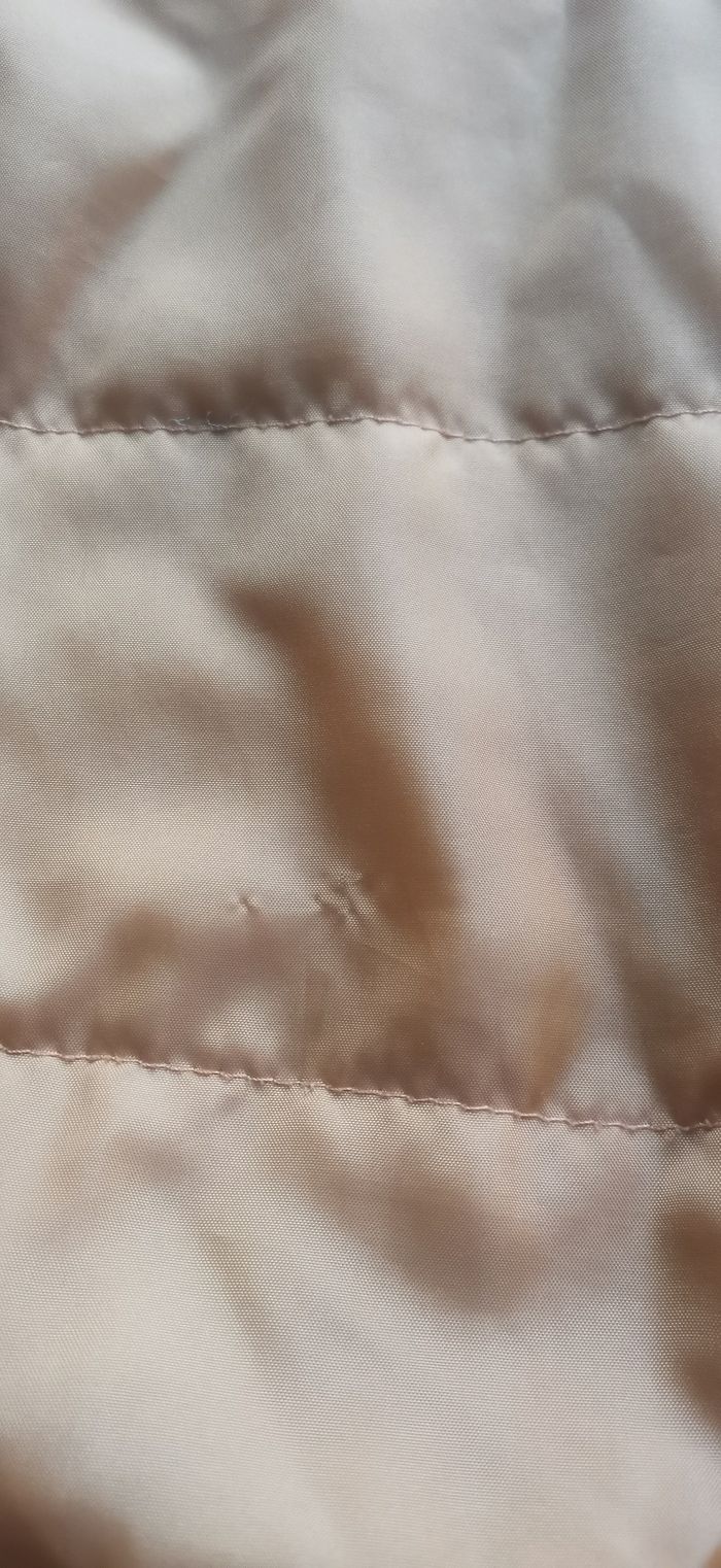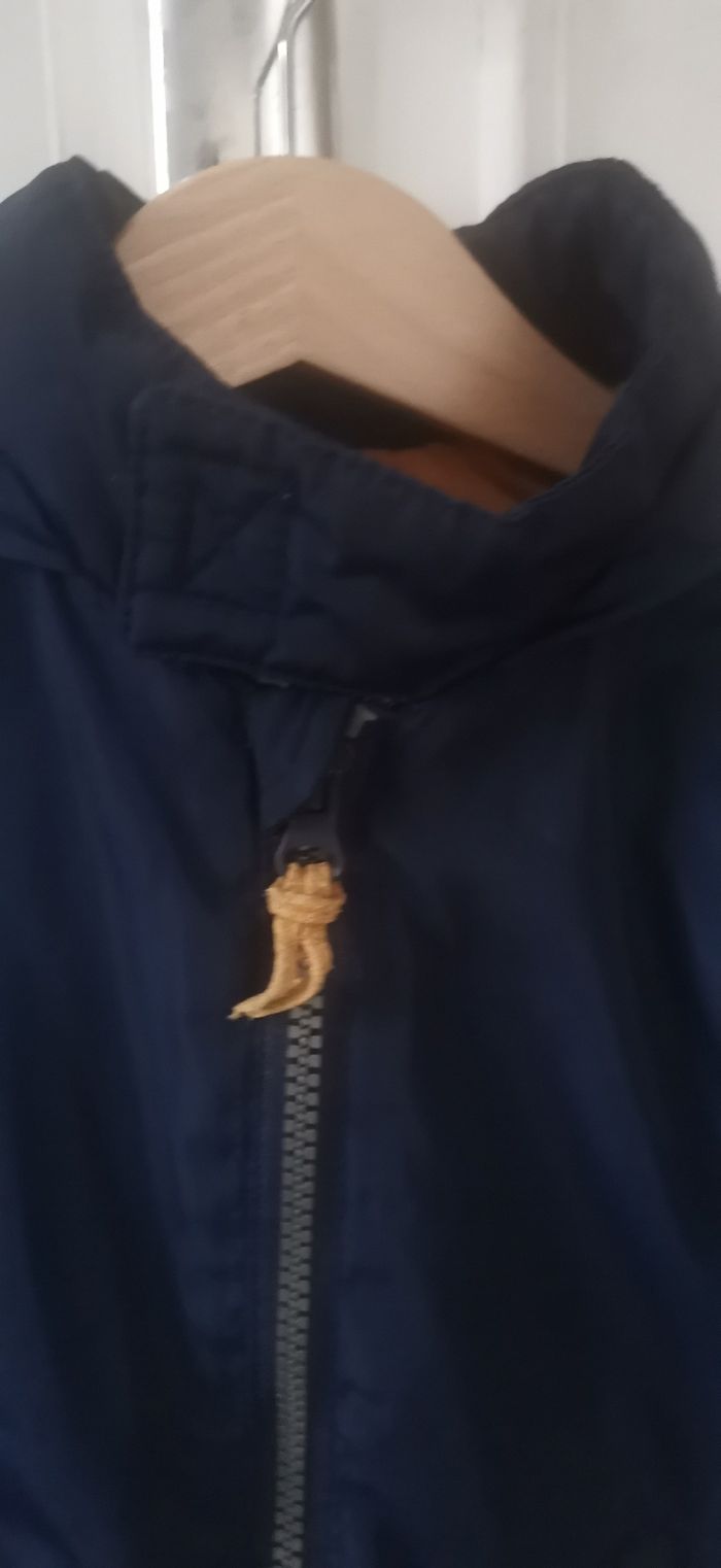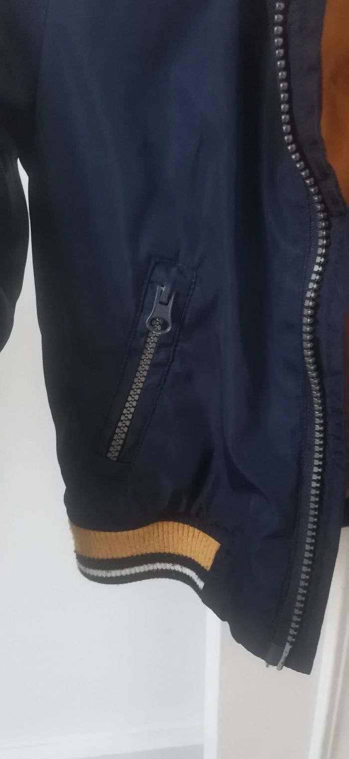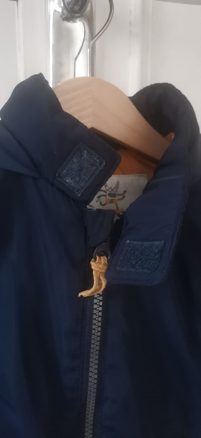 Blouson garçon bleu avec capuche. 2 poches latérales. À côté de la poche droite, il y des petits bouloches pas très visibles. En haut à côté du col côté droit aussi, il y quelques bouloches aussi. À l'intérieur, tissu jaune est un peu fripé.