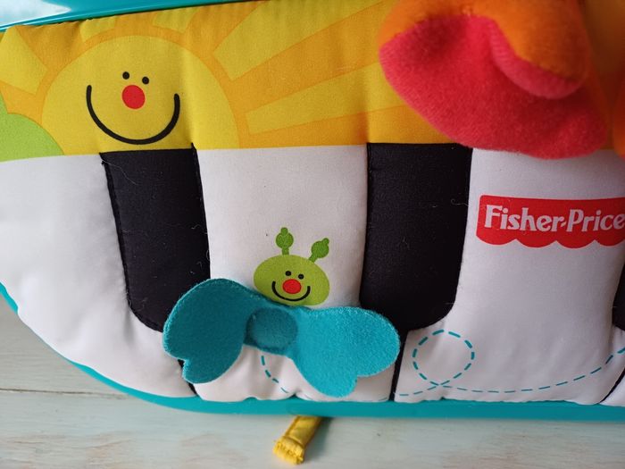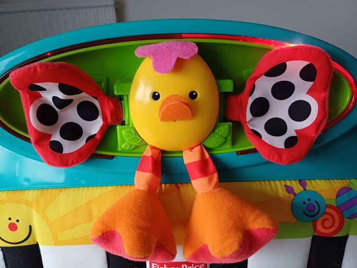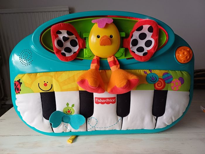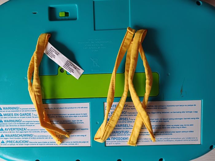Peut s'attacher au parc pour que bébé y joue avec ses pieds. Fait de la musique, des melodies et de la lumiere. Le son est réglable. Les touches sont en tissus