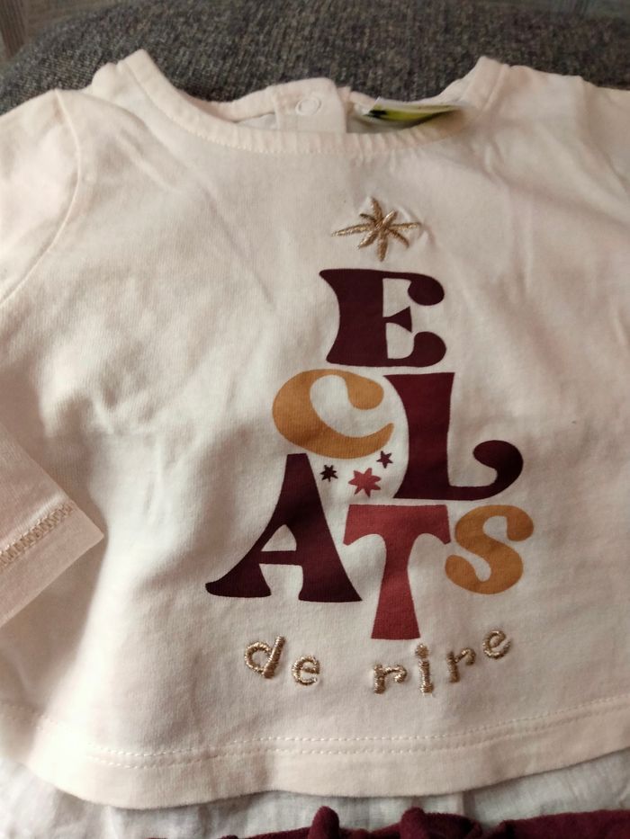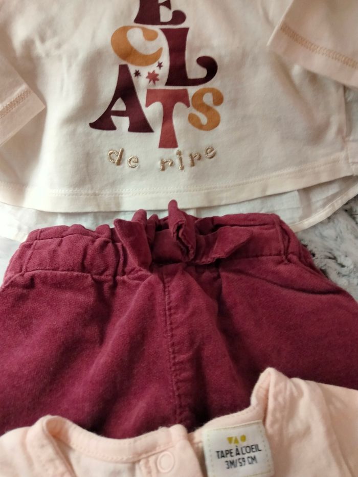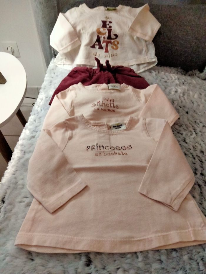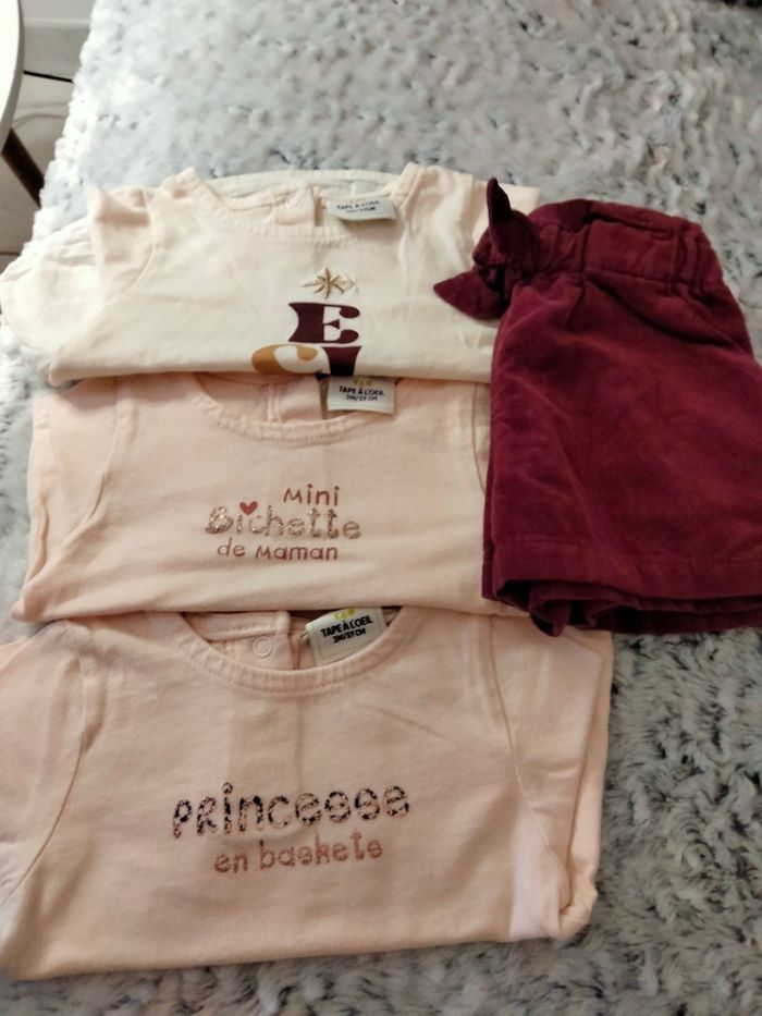 Les vêtements sont propres certains sont neufs. Lot 3 mois 3 tee shirt manches longues et un short.en velours .