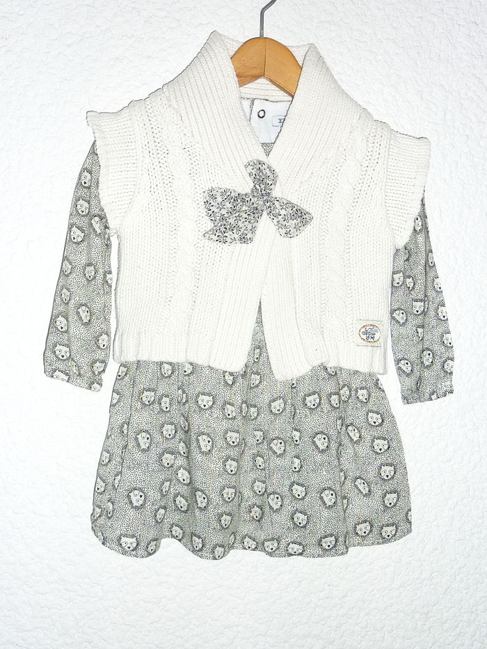 Ensemble de marque IKKS en état excellent composé d'une robe finement doublée, Imprimé noir et doré, associée au gilet couleur crème orné d'un noeud imprimé.