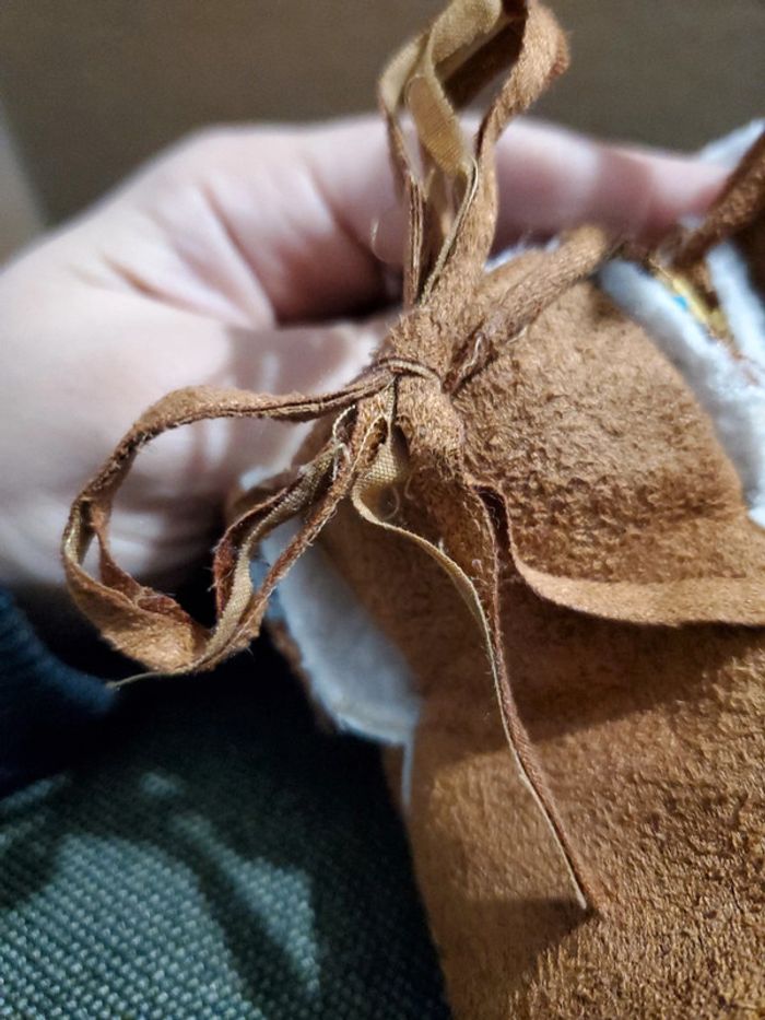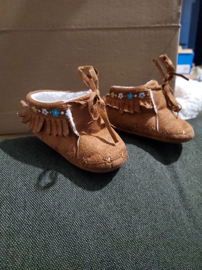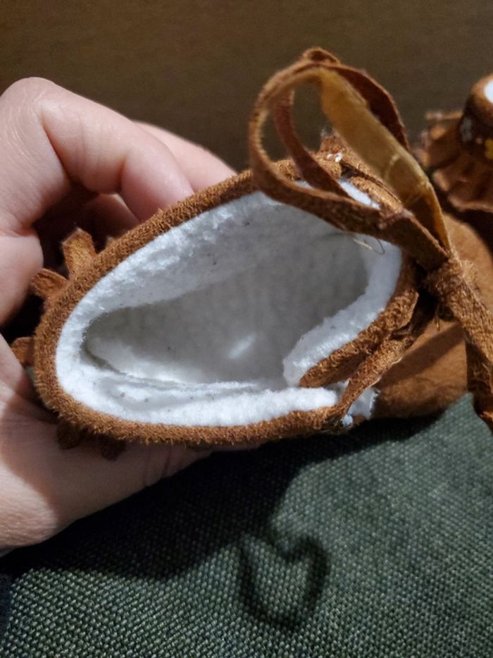 Chaussure fourrées obaibi taille 17/18 très bon etat sauf les lacets qui se dedoublent ( voir photo), cela ne gêne en rien pour attacher les chaussures.
