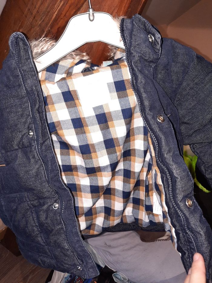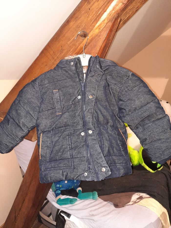 Manteau bleu marine de chez okaidi en 23 mois, en très bon état, bien epais, avec capuche en fourure synthétique
