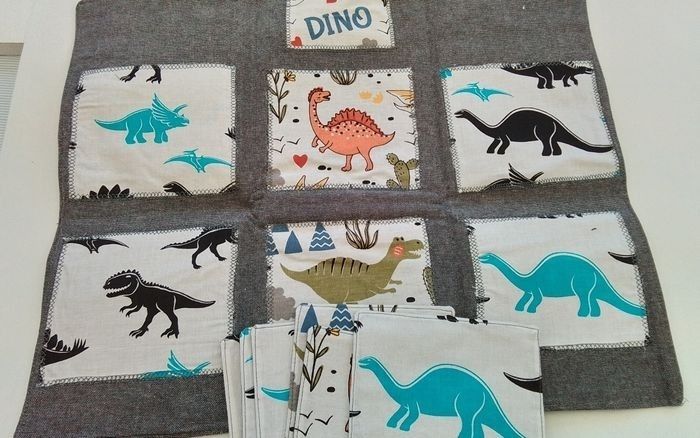 Pochette jeu loto en tissu 1 plaque avec 6 dinosaures différents et leur double Neuf fait main Idéal comme premier jeu