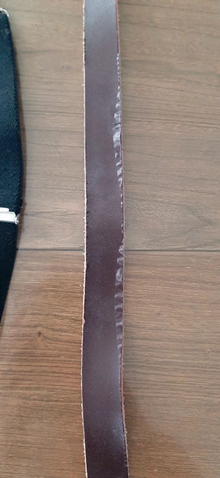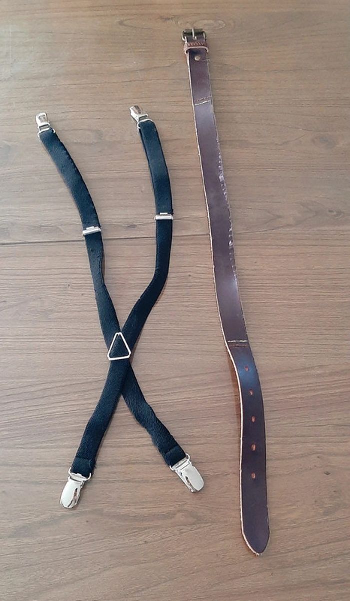 Lot composé d'une paire de bretelles noires à pince + une ceinture en cuir marron de 65 cm (le revêtement se décolle) #ceintureenfant #bretellesenfant #ciya76accessoiresenfant