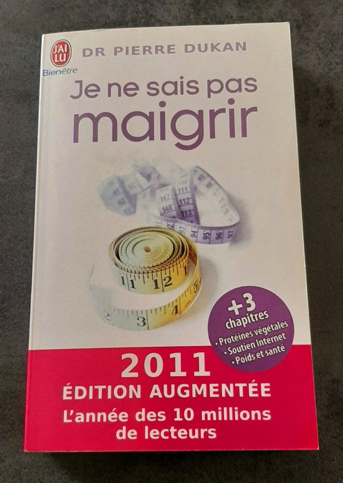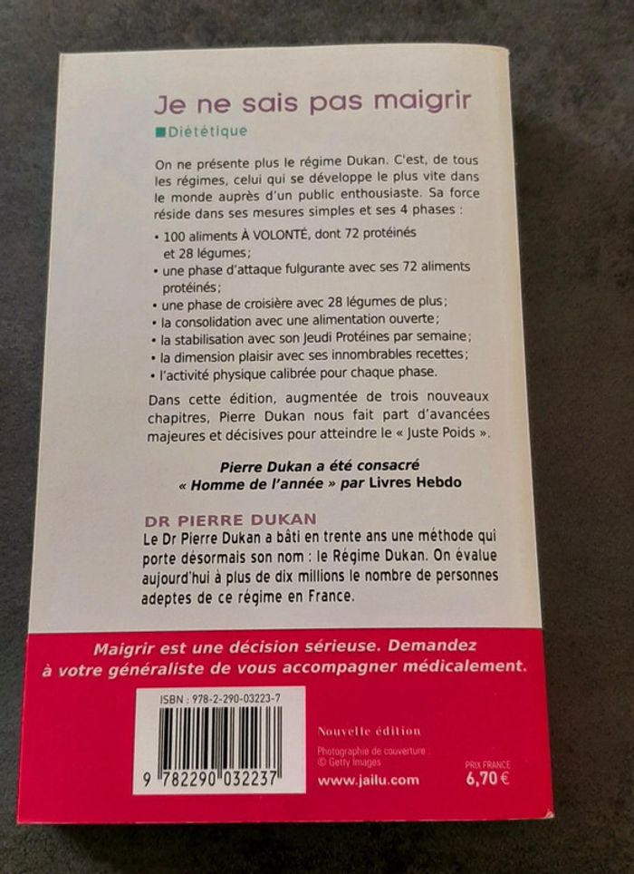 "Je ne sais pas maigrir" du Dr Pierre Dukan On ne présente plus le régime Dukan. C'est aujourd'hui celui qui fait le plus d'adeptes à travers le monde, auprès d'un public toujours plus enthousiaste. Sa force réside dans sa simplicité et ses 4 phases : une phase d'attaque fulgurante avec ses 72 protéines, une phase de croisière avec 28 légumes ajoutés, une phase de consolidation avec une alimentation ouverte, une phase de stabilisation avec son "Jeudi Protéines" par semaine. 100 aliments, 72 protéines et 28 légumes à volonté. La dimension plaisir avec ses innombrables recettes. L'activité physique calibrée pour chaque phase. Dans cette édition augmentée de trois nouveaux chapitres, le Dr Pierre Dukan nous fait part d'avancées majeures et décisives pour atteindre le "Juste Poids". #livrerégimedukan #ciya76livres #noel2023