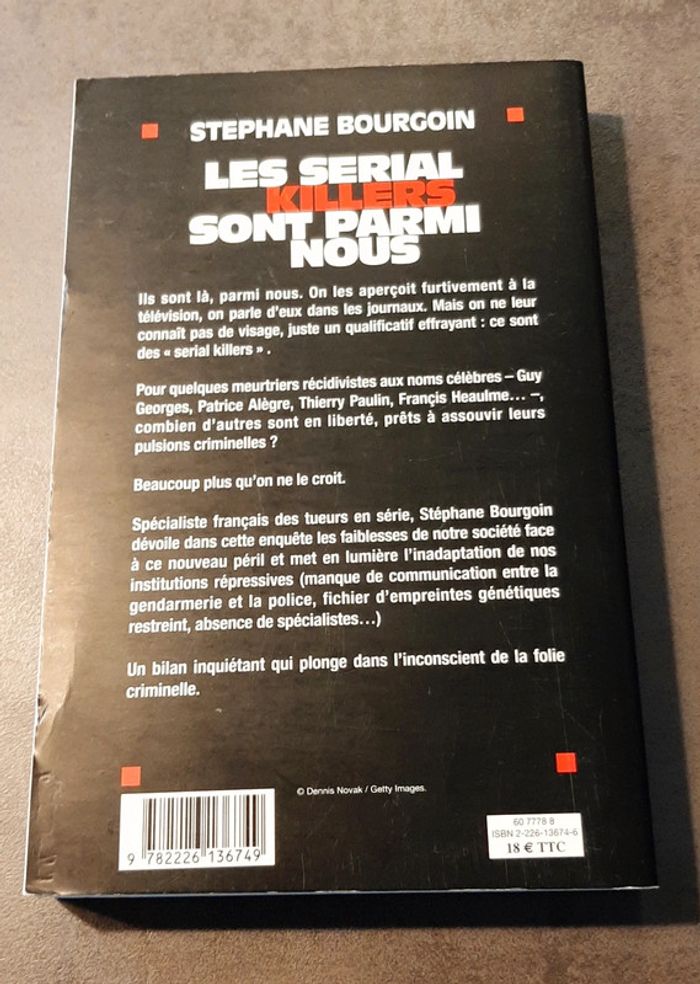 "Les serial killers sont parmi nous" de Stéphane Bourgoin Ils sont là, parmi nous. On les aperçoit furtivement à la télévision, on parle d'eux dans les journaux. Mais on ne leur connaît pas de visage, juste un qualificatif effrayant : ce sont des "serial killers". Pour quelques meurtriers récidivistes aux noms célèbres - Guy Georges, Patrice Alègre, Thierry Paulin, Françis Heaulme... -, combien d'autres sont en liberté, prêts à assouvir leurs pulsions criminelles ? Beaucoup plus qu'on ne le croit. Spécialiste français des tueurs en série, Stéphane Bourgoin dévoile dans cette enquête les faiblesses de notre société face à ce nouveau péril et met en lumière l'inadaptation de nos institutions répressives (manque de communication entre la gendarmerie et la police, fichier d'empreintes génétiques restreint, absence de spécialistes...) Un bilan inquiétant qui plonge dans l'inconscient de la folie criminelle. Livre abîmé sur les premières pages (voir photo) #stephanebourgoin #serialkiller #ciya76livres #noel2023