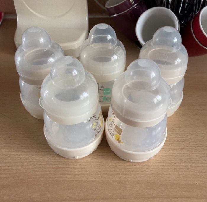 5 biberons de marque MAM, capacité 130 mL , vendu sans tétine. Bon état