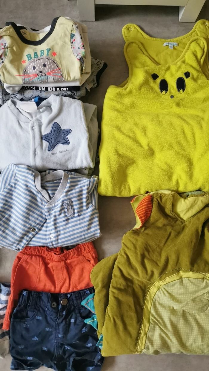 lot vêtements bébé garçons 3 mois 2 gigoteuse 2 shorts 6 pantalon 3 tenue été 2 salopettes 6 pyjamas 9 bodies 3 haut 2 pull / gilet marques petit bateau, kiabi, orchestra,... C