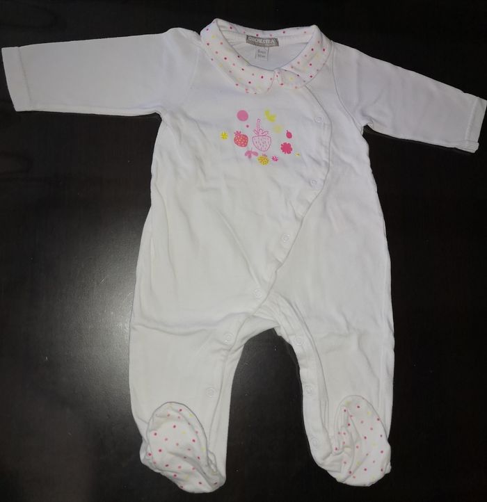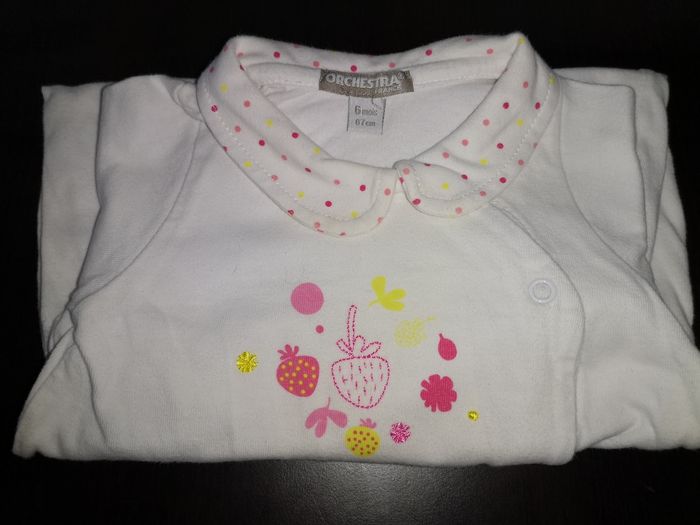 Pyjama léger Orchestra 6 mois (67cm), ouverture devant, blanc avec motifs petits points couleur sur le col et fruits sur le devant (voir photo 3), très bon état