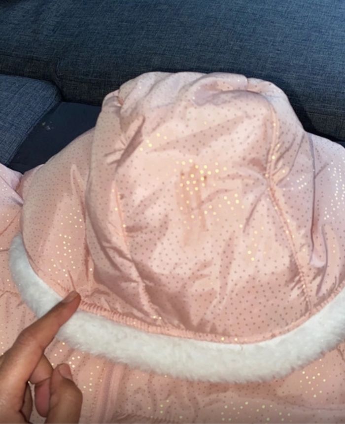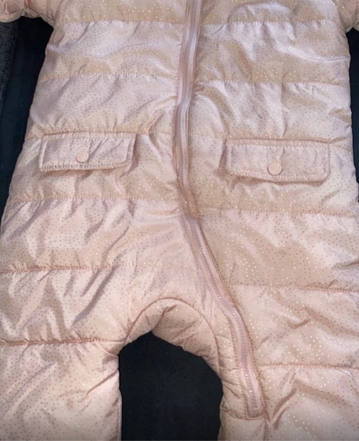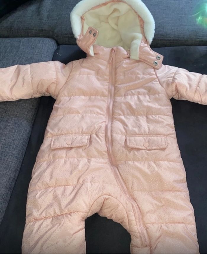 Combinaison rose, avec une petite tache au niveau de la capuche et un trait de stylo au niveau de la poche droite, voir sur photo portée qu’une journée tient chaud, notamment pour le ski taille 12 mois acheter chez orchestra