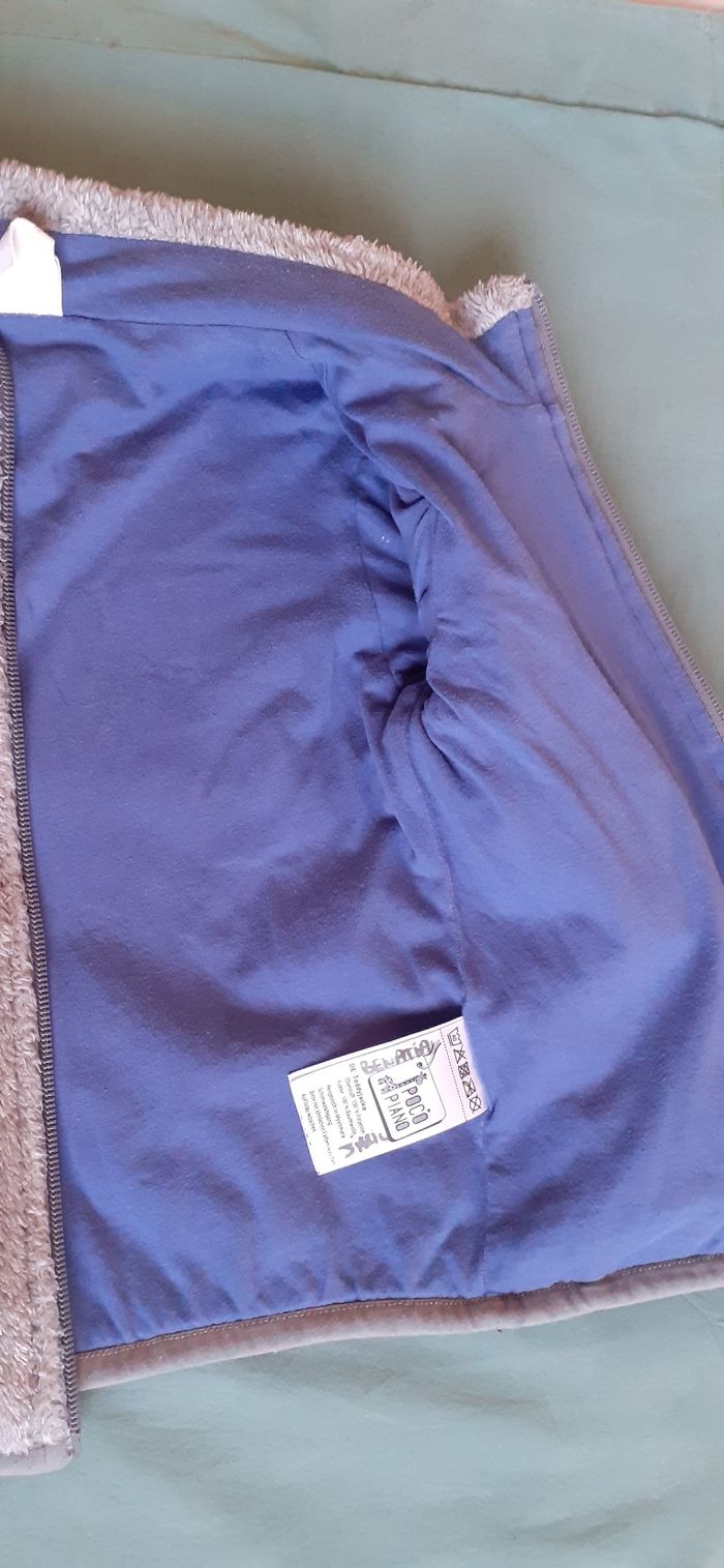 Vends une veste zippée en fausse fourrure 100% polyester grise avec doublure bleue marque Pocopiano 5 ans