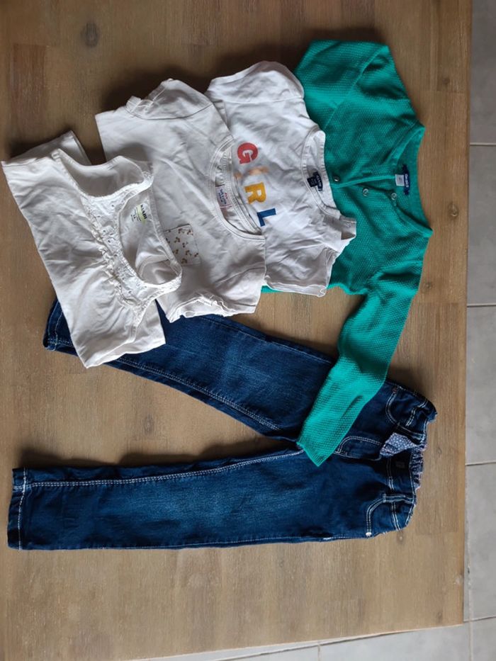 Lot comprenant 1 Jean (bouton cassé) orchestra 1 gilet okaidi 2 tee shirt kiabi 1 tee shirt tape à l'œil