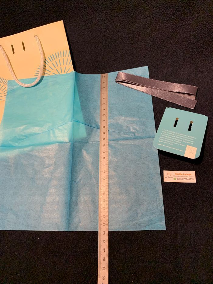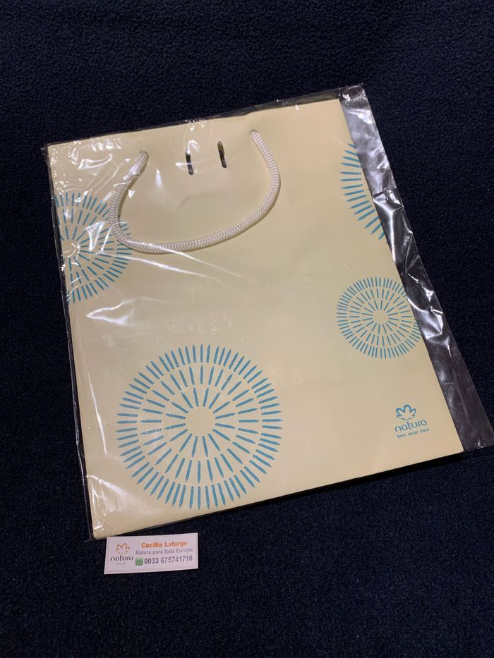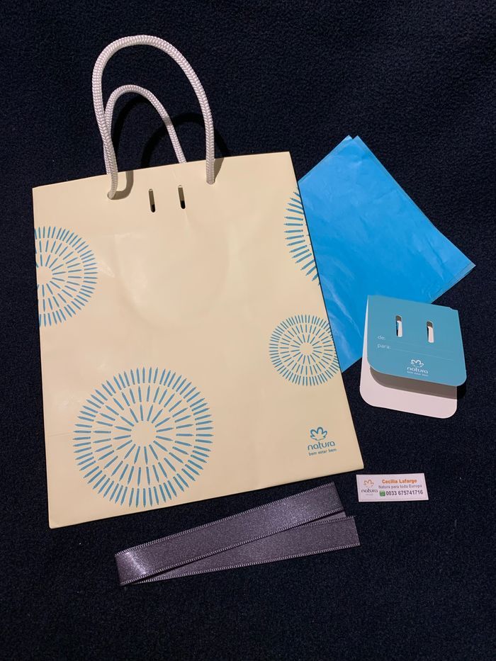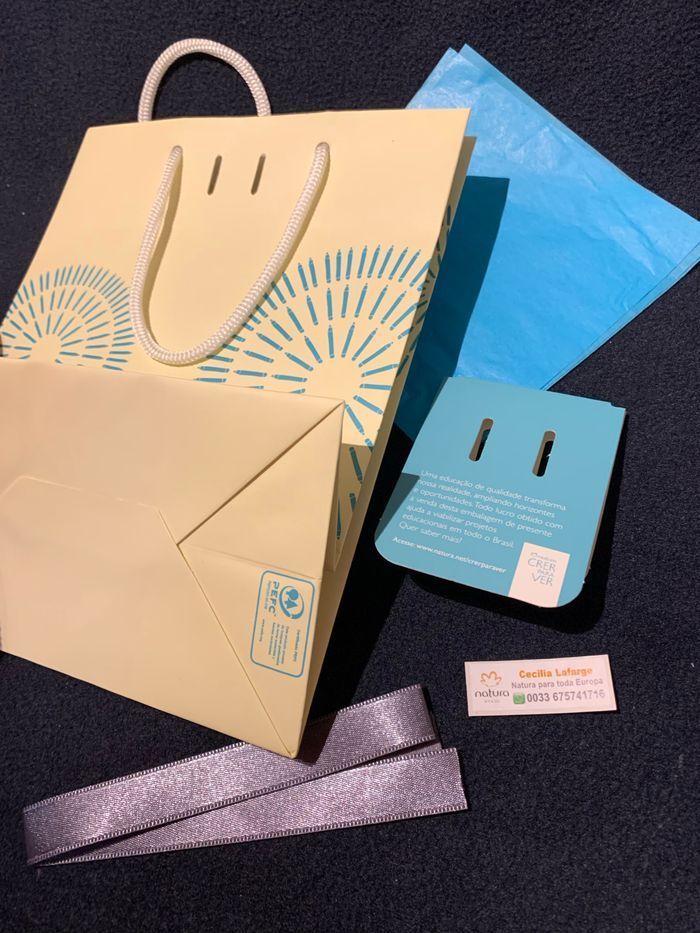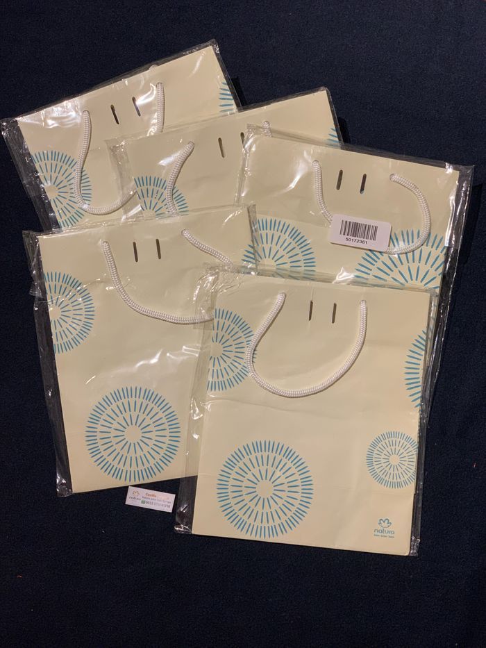 CINQ sacs en papier, vide, pour emballage cadeau, couleur crème Avec petit papier soie couleur turquoise, ruban gris et une étiquette pour fermer, poignées cordon blanc Dimensions : H22 x L18 x 10cm Facile à déplier À personnaliser ou autre Marque : Natura Brasil #emballagecadeau #sacpapier #loisirscreatifs #naturabrasil #cc_boitesacemballage #cc_naturabrasil
