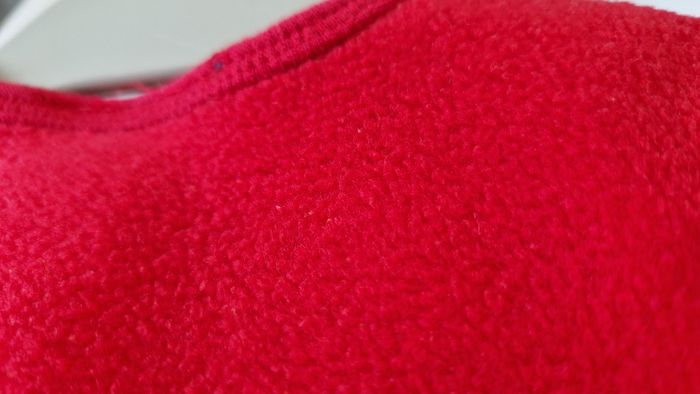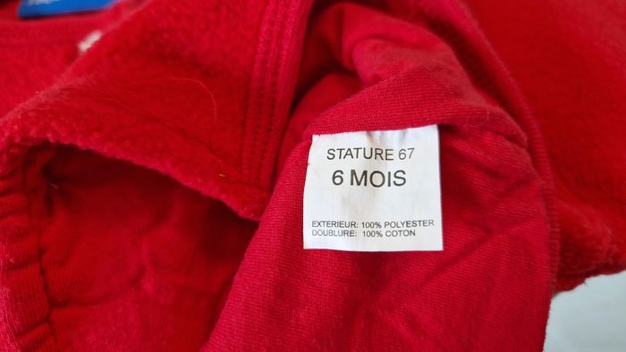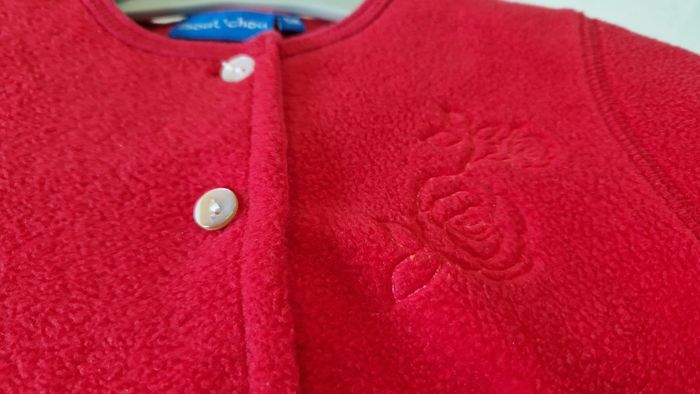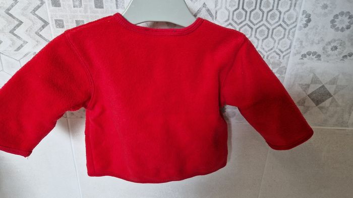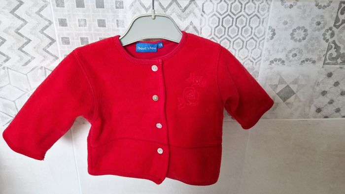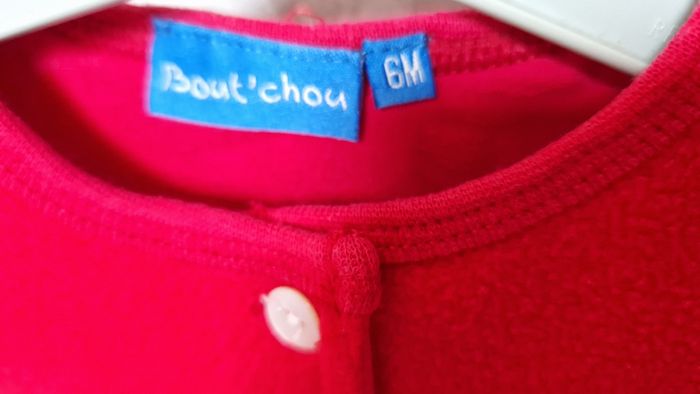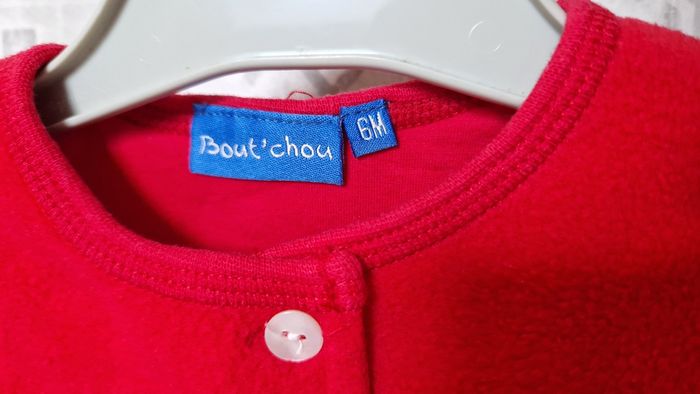 Gilet polaire marque Bout'chou. Taille 6 mois. Couleur rouge. Fleur brodée. Très bon état, comme neuf. Extérieur 100 % polyester, doublure 100 % coton