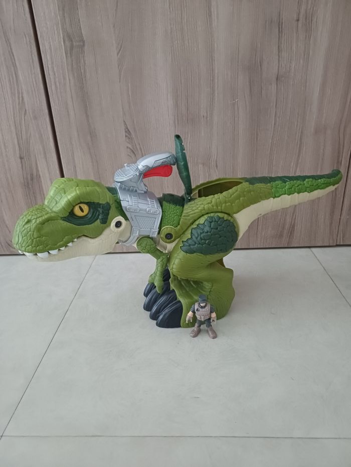 Dinosaure avec bonhomme très bonne état La manette rouge pour appuyer pour ouvrir la gueule du dinosaure et la trappe qui s'ouvre pour mettre des choses de dans