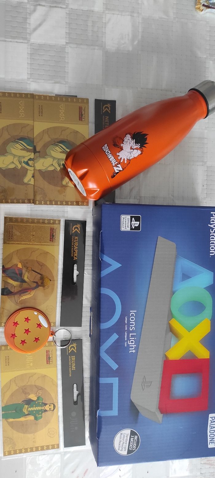 Bonjour Je vend ce lot de gaming manga neuf Rien n'a été utilisé, tout est neuf Ticket d'or officiel HunterxHunter x4 Un porte clé et sa gourde Dragon ball neuf officiel Lampe Sony, neuf encore sous blister à l'intérieur avec notice #hunterxhunter #dragonball #tickeyd'or #sony
