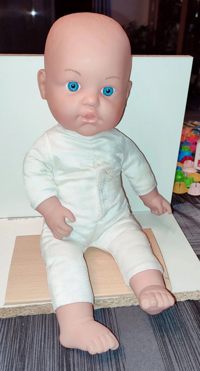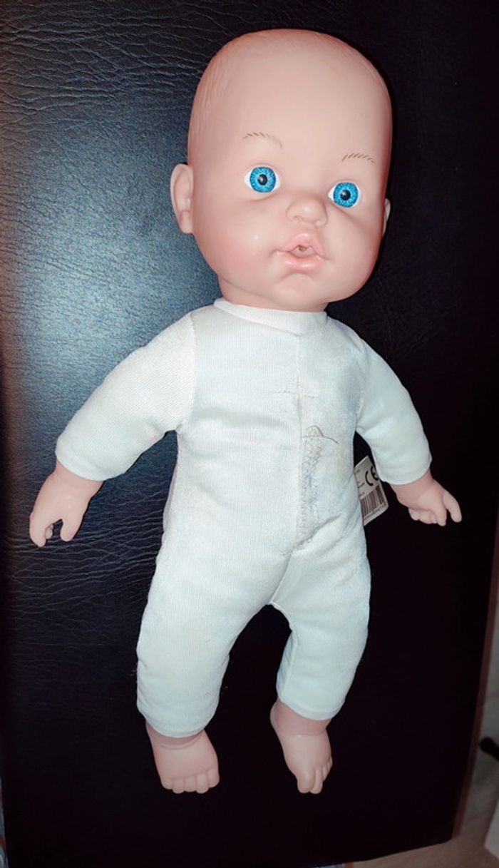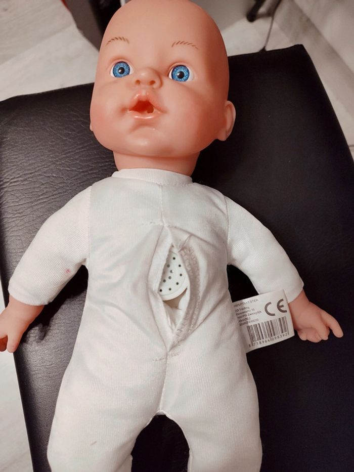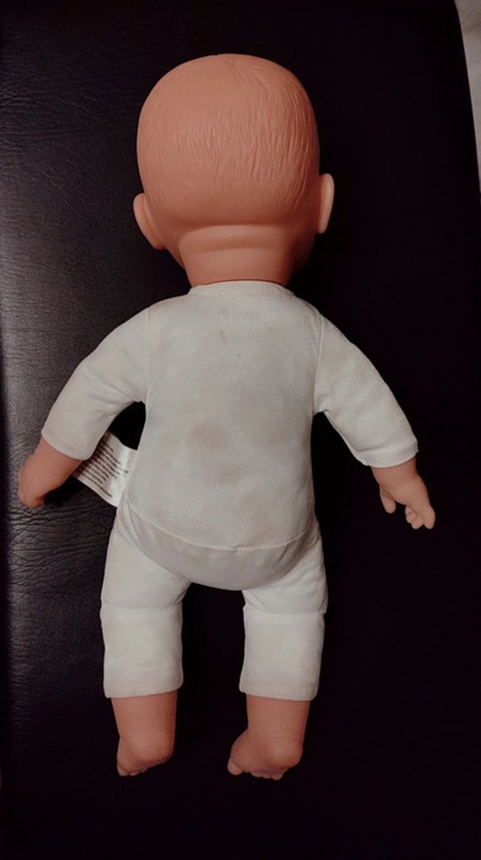 Il a un cœur électronique, il émet plusieurs sons de bébé, pleurs, gazouillis, rire... Il a de très légères traces sur le visage et des taches sur le corps en tissu, vu à l'image