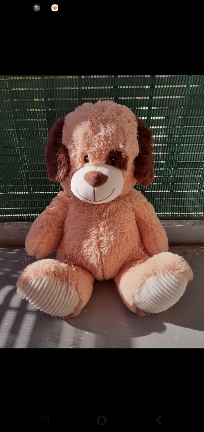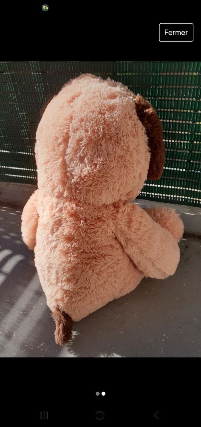 CHIEN en peluche Neuf Hauteur 65 cm Marron clair, oreilles et 1 œil marron foncé Dessous des pattes écru 100% polyester Poils de 2 cm, très doux au toucher Tiens assis