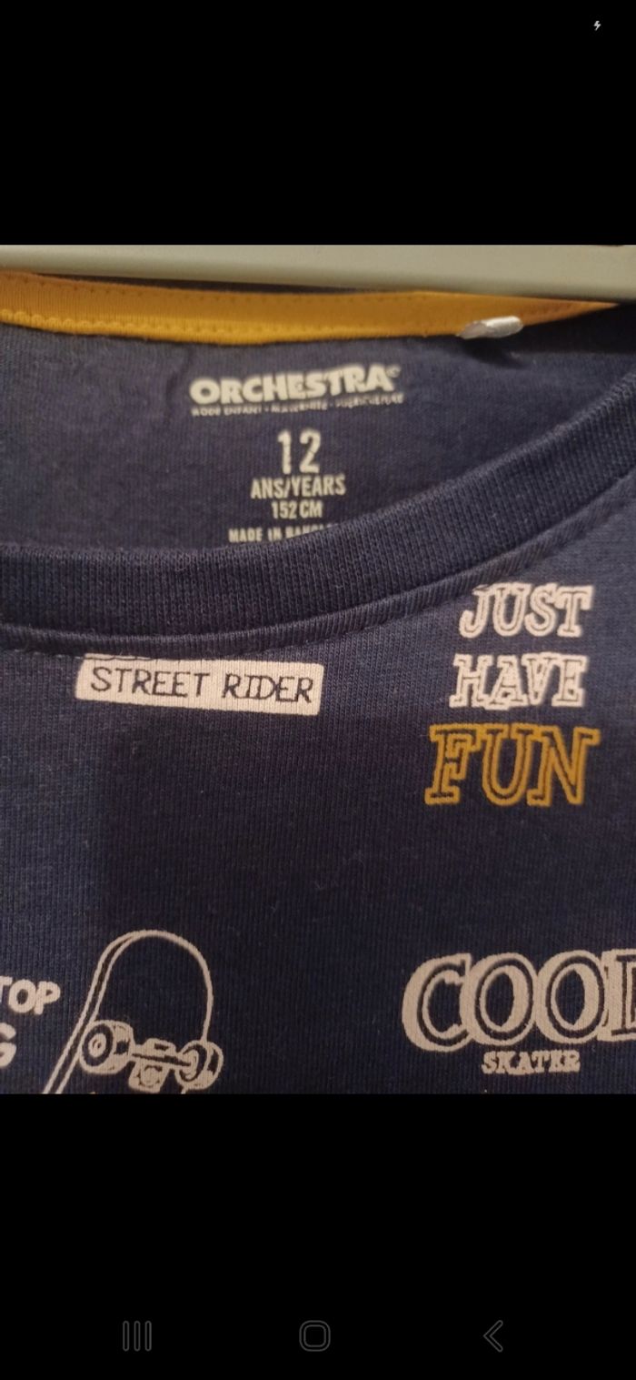 Bonjour ✴️Je vend ce tee-shirt en parfait état ✴️Couleur bleu marine imprimé skate blanc et jaune moutarde ✴️De la marque Orchestra ✴️100% coton ✴️Manches longues et col rond ✴️Taille 12ans 152cm