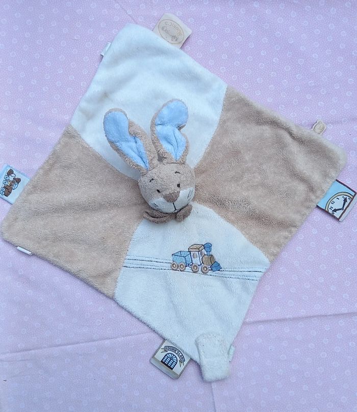 Doudou carré plat en velours de couleurs blanc et beige et de l autre côté en tissu de couleur beige Lapin sur le milieu du doudou Train brodé sur le doudou Étiquettes sur le contour du doudou Attache tétine sur le coin du doudou