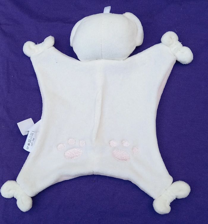 Doidou plat en velours de couleur blanc et rose pâle Empreintes de paires brodées à l arrière du doudou Intérieur des oreilles en velours de couleur rose à pois Joues spirale en fil violet