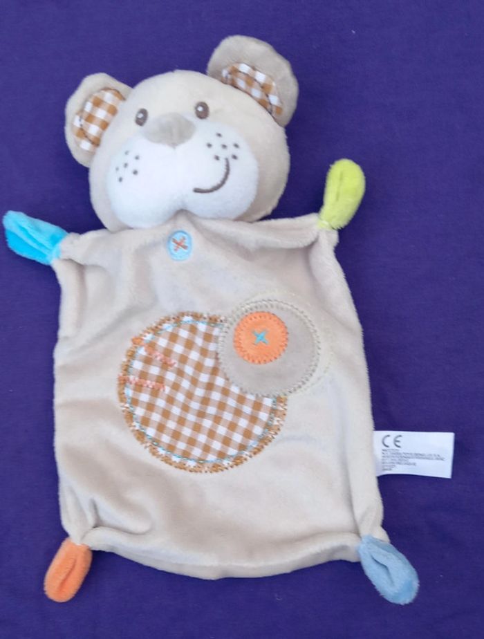 Doudou rectangulaire en velours de couleurs taupe et blanc Intérieur des oreilles et son ventre en tissu vichy de couleurs blanc et marron Noeud en velours de couleurs vert , turquoise, orange et bleu sur les coins du doudou