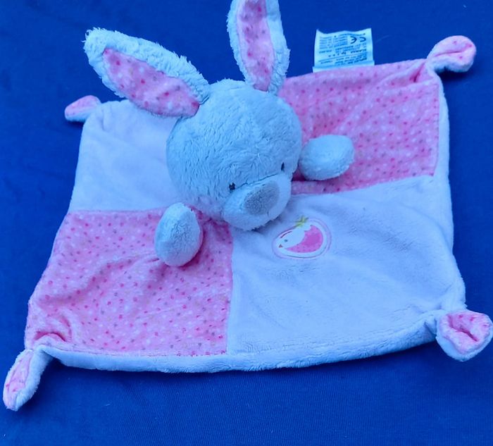 Doudou carré plat en velours de couleurs rose et rose à pois Lapin sur le milieu du doudou Écusson poule cousu sur le doudou