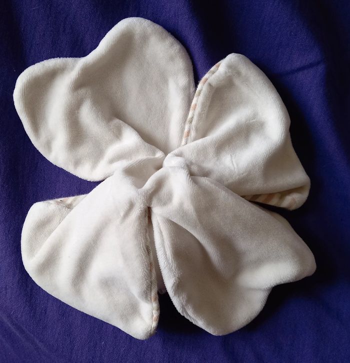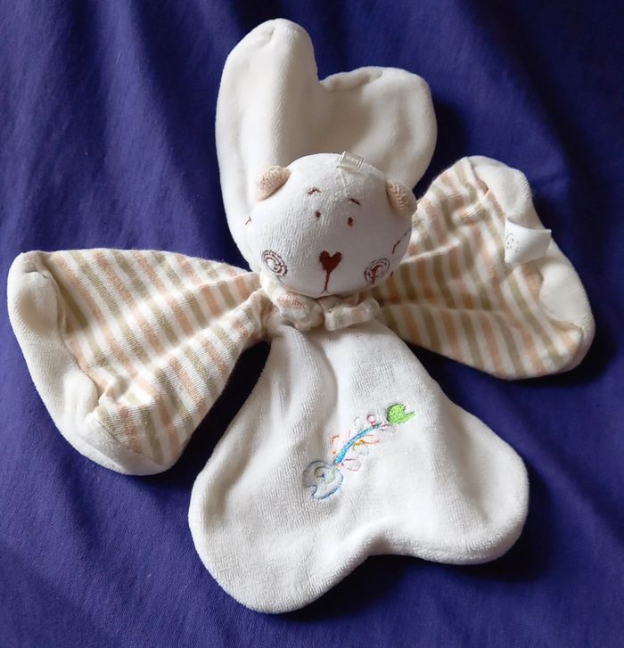 Doudou plat en forme de trèfle à quatre feuilles en velours de couleur blanc et en tissu rayé Chat sur le milieu du doudou Arrête de poisson brodé sur le doudou