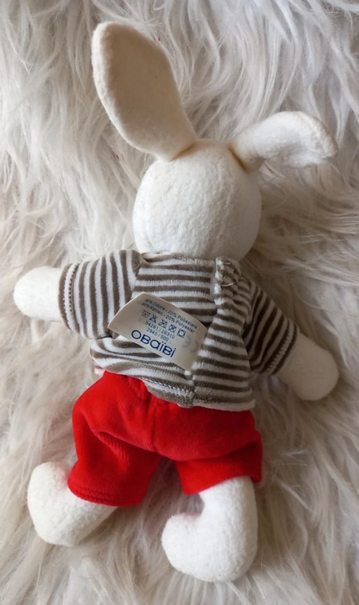 Doudou peluche lapin en velours de couleur blanc Vêtu d un pantalon en velours de couleur rouge et d un Haut à rayures avec inscription broder sur le haut ' Obaibi ' Longueur ; 26 cm
