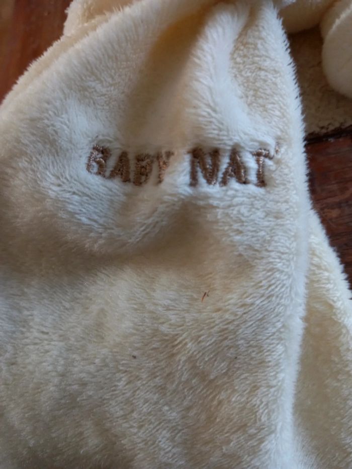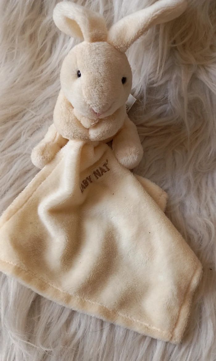 Doudou peluche lapin en velours de couleur blanc crème Tiens entre ces pattes un mouchoir avec inscription broder ' Baby Nat '