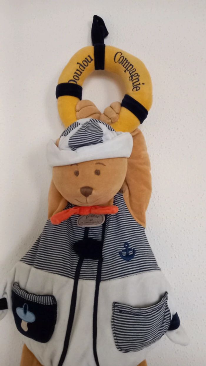 Doudou et compagnie Range pyjama ours en velours de couleur marin bleu et blanc 2 petites poches avec 1 motif tétine pour y mettre sa tétine Ours accrocher sur une bouée de sauvetage avec inscription "Doudou Compagnies Nœud en velours de couleur saumon Longueur total : 65 cm