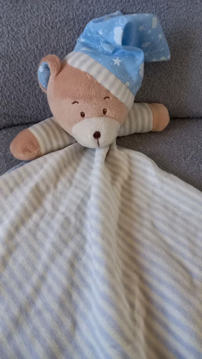 Grand doudou lange ours bleu blanc rayés- bonnet de nuit - photo numéro 2