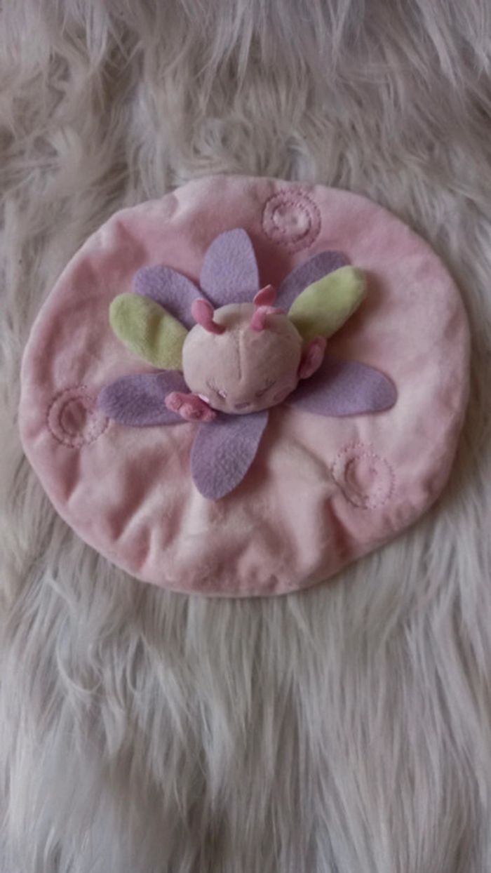 Doudou rond plat en velours de couleur rose Spirales brodées sur le doudou Papillon sur le milieu du doudou Pétales de couleurs mauve et vert autour de son cou