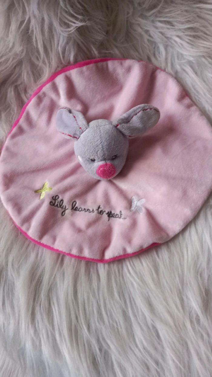 Doudou plat rond en velours de couleurs rose et de l autre côté en velours de couleur rose fushia Lapin sur le milieu du doudou Écritures brodées sur le doudou " Lily Learns To Speak " et motifs papillons