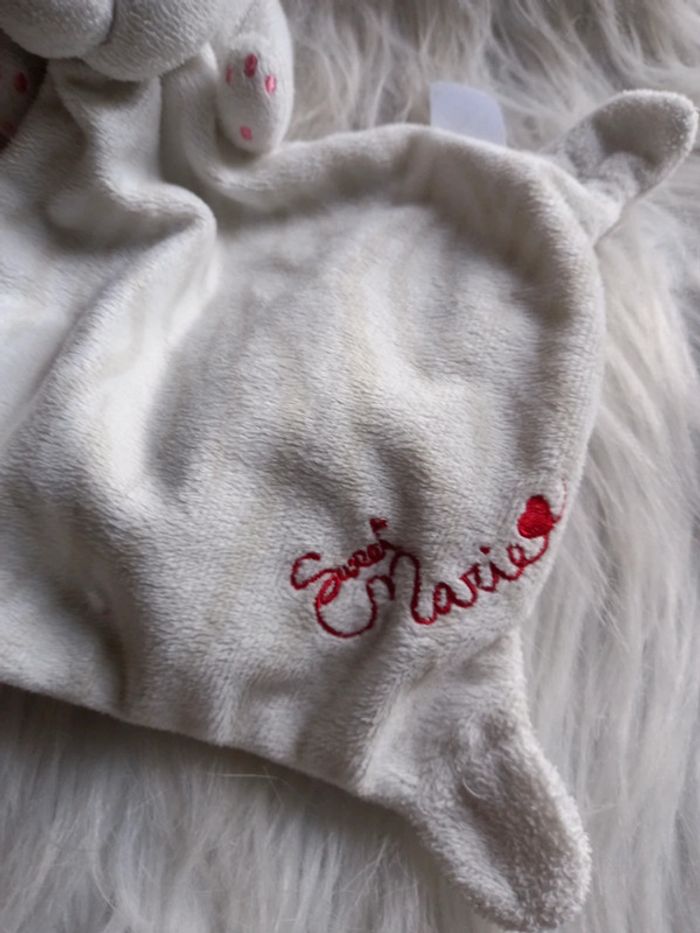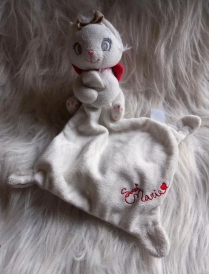 Doudou peluche chat Aristochat en velour de couleur blanc et à l'arrière au niveau du cou , un nœud de papillon en velours de couleur rouge . Tien entre ces mains un mouchoir avec écritures brodées de couleur rouge Sweet Marie Nœud de papillon ( légèrement usé) de couleur doré sur la tête.