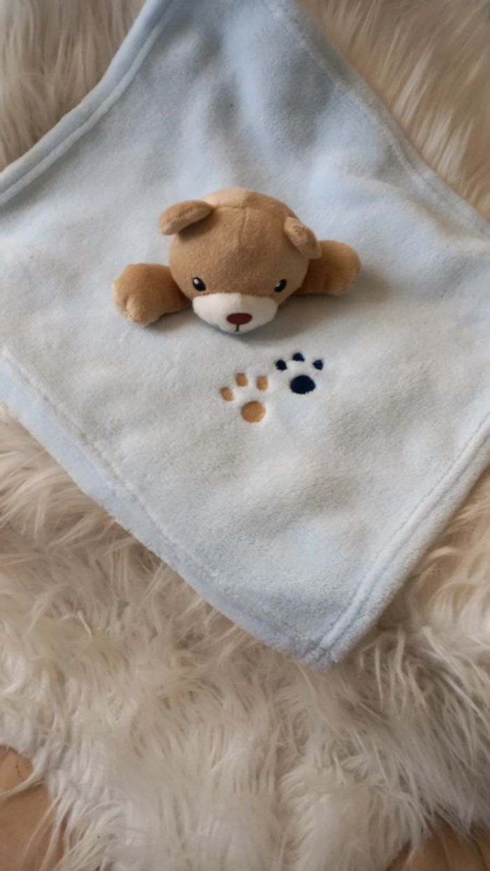 Doudou carré plat en velour polaire de couleur bleu Ours beige et blanc sur le milieu du doudou Empreintes de couleurs bleu.et doré brodés sur le doudou