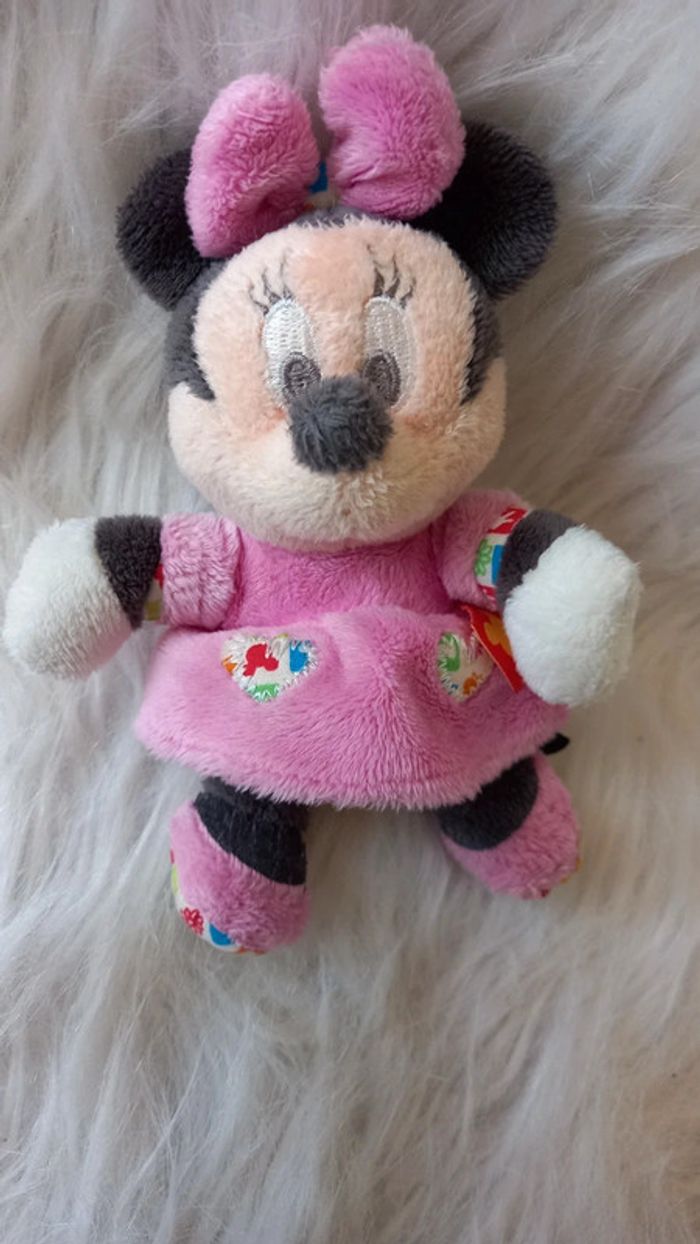 Doudou petite peluche Minnie Vêtue d une robe en velour de couleur rose assorti à son nœud sur la tête