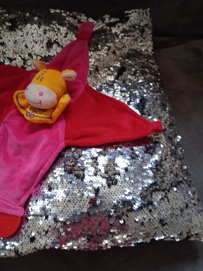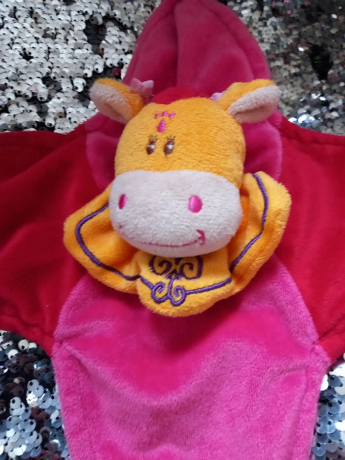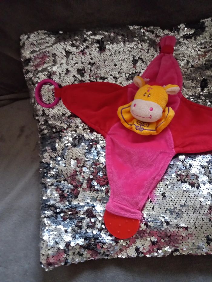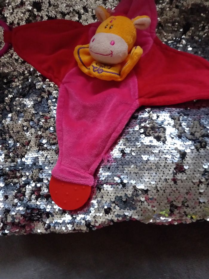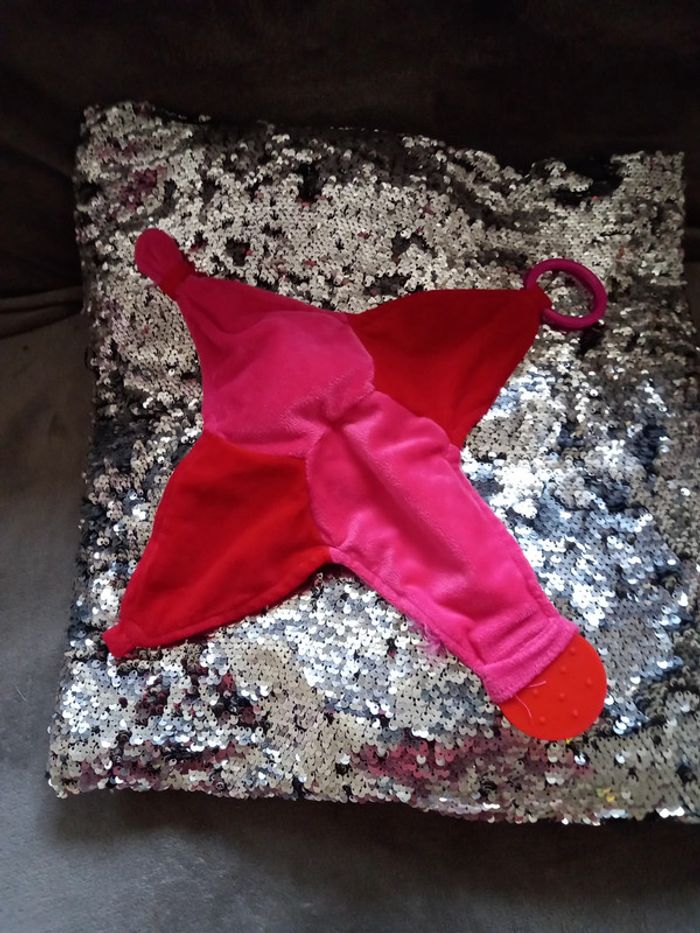 Doudou forme étoiles rose à rose foncé avec tête de cheval au milieu dans les coins 1 anneau 1 nœud et dentition Marque : Nattou Très bon état
