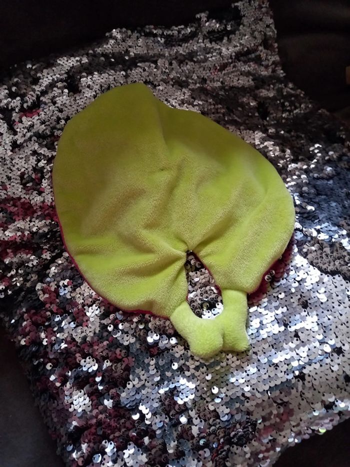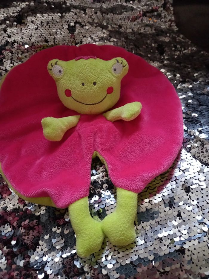 Doudou rond plat Grenouille de couleurs rose fushia et verte pomme Grenouille avec sourire Article en parfait état Marque : Nicotoy