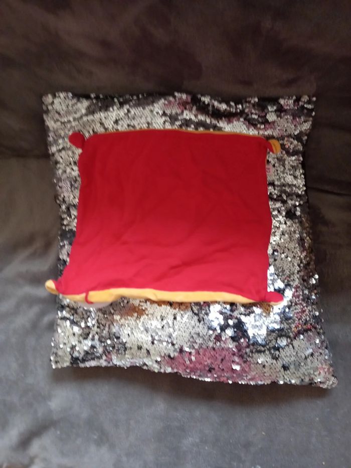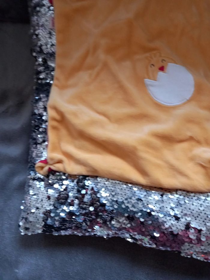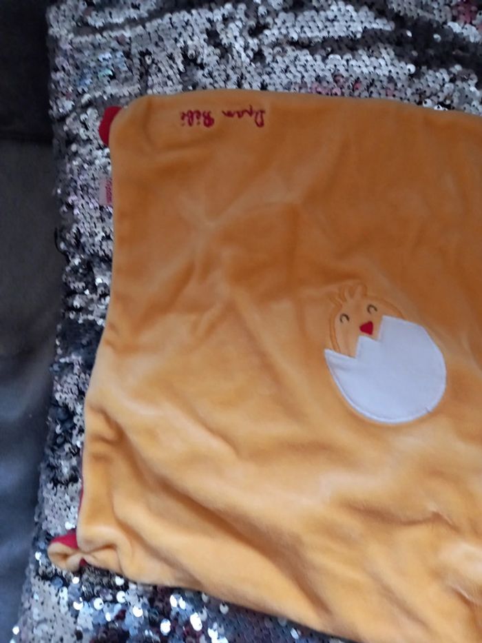 Grand doudou carré de couleur orange avec poule rouge et blanche et motif au milieu du doud poussin sortant de sa coquille Écritures brodée en rouge la marque du Doudou Marque : D Pan Bébé Article en parfait état