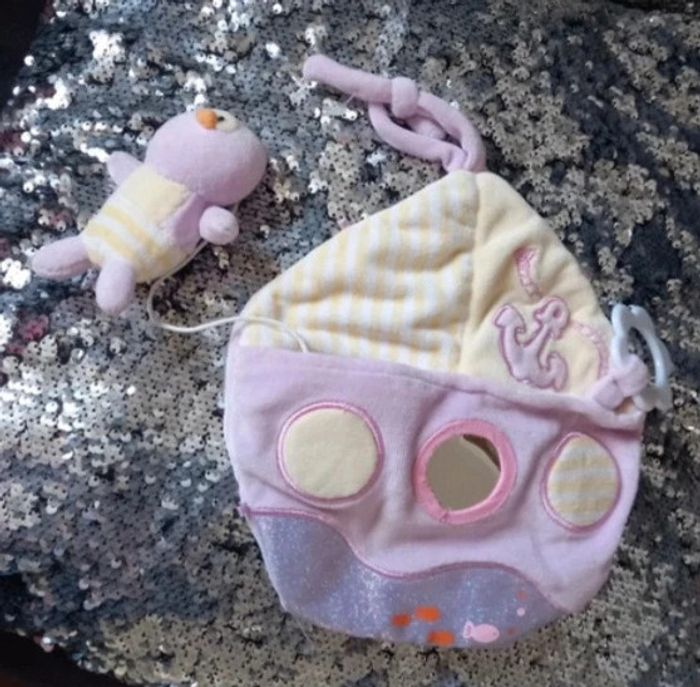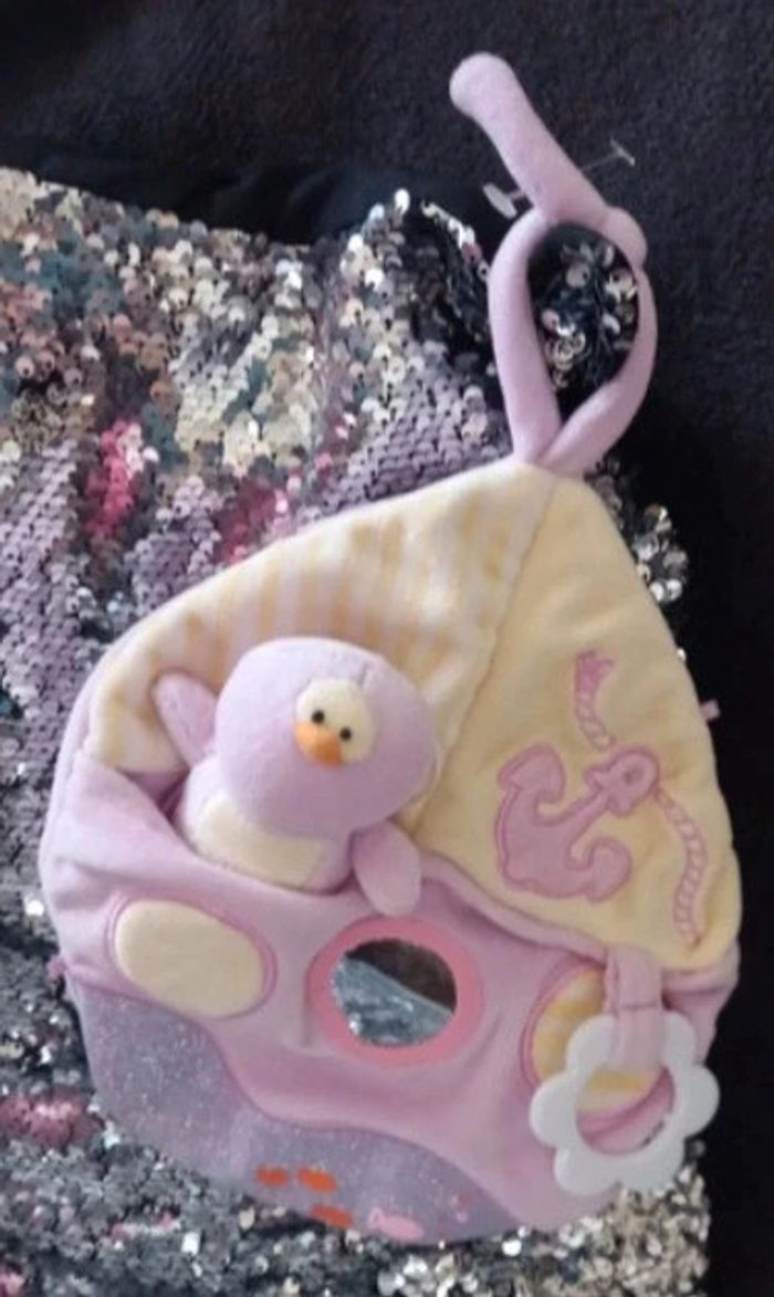 Doudou bateaux rose et jaune avec motif ancre un miroir sur l un des hublots , et un anneau en forme de fleur blanche, vagues brillantes avec motifs poissons et bruits papiers froissés et 1 pingouin Marque : Baby Jemini État neuf